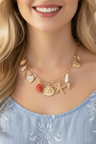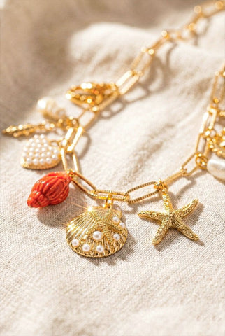 Capture the beauty of coastal sunsets with this enchanting shell charm necklace. Featuring a delicate ghost seashell, twinkling stars, and vibrant coral accents, this piece brings the ocean's magic to your everyday style. Perfect for beach lovers and anyone who treasures the sea's serene charm. A wearable reminder of sun-kissed shores and peaceful waves.